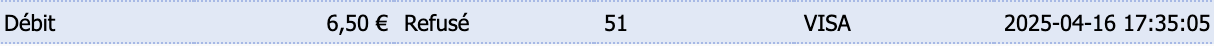 Ex : Sur cette transaction avec le Statut "Refusé", le code erreur est "51".