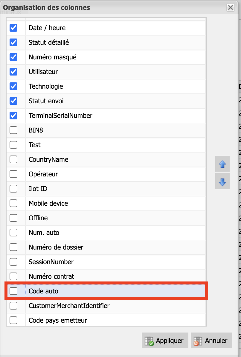 - Cochez la colonne "Code auto" pour l’afficher dans la liste. Cette colonne indique un "code erreur" associé à chaque transaction refusée.