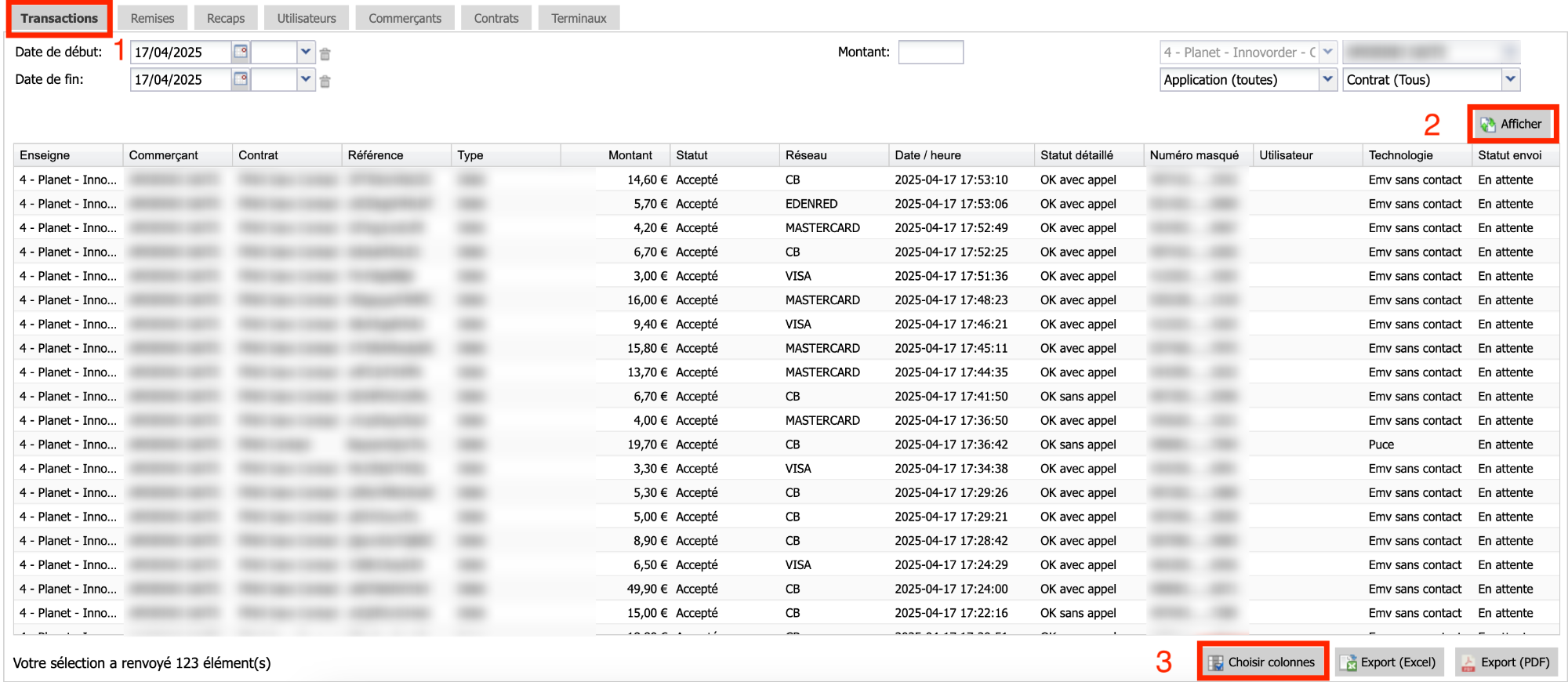 Recommandation : Grâce aux flèches à droite, remontez le champ "Code auto" jusqu'au champ "Statut" afin de mieux repérer les transactions refusées, et remarquer plus facilement le code erreur associé.
