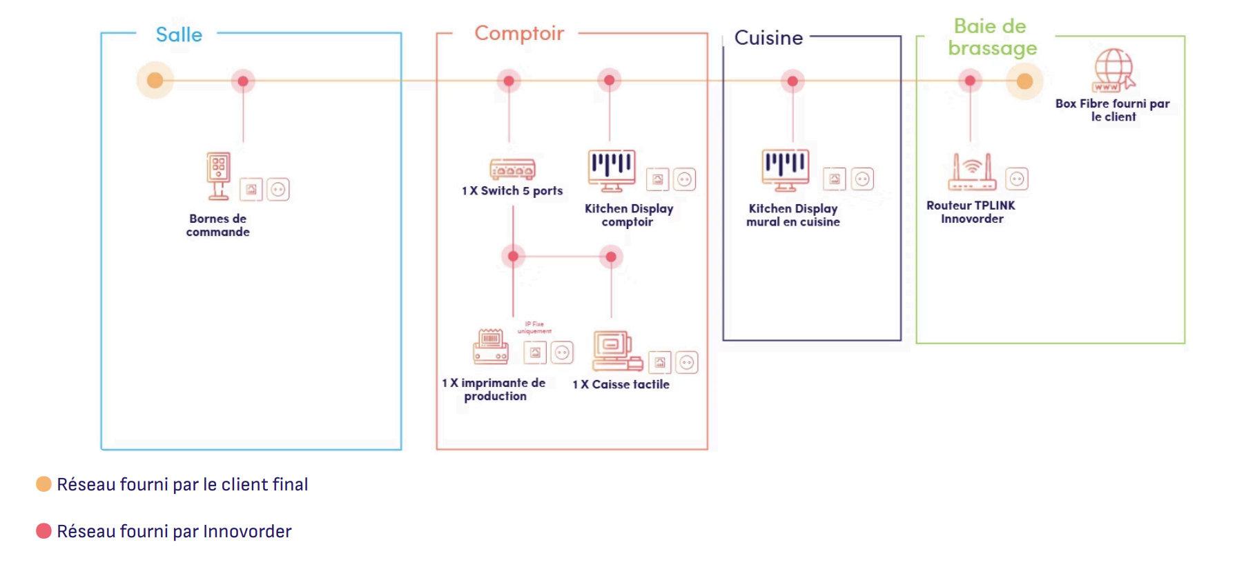 - Tous les équipements (bornes, caisses, KDS, imprimantes) doivent être sur le même réseau local (LAN)